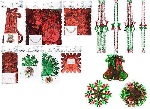 7 ASST. STYLES GREE/RED FOIL HANGING DECORATIONS